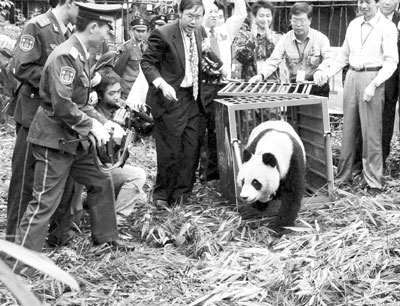 荊楚網(wǎng)消息(楚天都市報(bào))一只野生大熊貓日前闖入四川省都江堰鬧市(本報(bào)曾予報(bào)道),被當(dāng)?shù)亓謽I(yè)部門(mén)營(yíng)救,并被送往臥龍自然保護(hù)區(qū)療養(yǎng)。8月8日,戴有GPS衛(wèi)星定位儀器的大熊貓被放歸都江堰龍溪虹口國(guó)家自然保護(hù)區(qū)。當(dāng)天,它沒(méi)說(shuō)拜拜就踏出鐵籠走入密林,前后不到10秒鐘?蒲腥藛T在今后一年多的時(shí)間內(nèi),將對(duì)它進(jìn)行定位跟蹤,這有助于科學(xué)家進(jìn)一步了解和掌握大熊貓野外生活習(xí)性和活動(dòng)規(guī)律。(新華社發(fā))