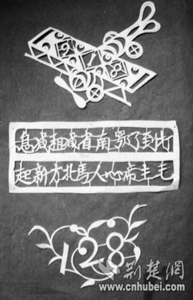 中國剪紙起源于裝飾藝術(shù)。樣式有窗花、燈花、喜花以及鞋墊花等。其中用來制作繡花底樣的雕花剪紙又名“花樣”,主要是供婦女刺繡使用的圖案底稿,大多是與民眾日常生活關(guān)系密切的傳統(tǒng)圖案。此次發(fā)現(xiàn)反映抗戰(zhàn)主題的50多張花樣剪紙,從構(gòu)圖、技法上看,比較稚嫩、粗糙,但充分體現(xiàn)了藝人們的創(chuàng)新精神。其中最顯眼的是一張邊緣殘缺、破舊的黃裱紙,上面依稀可見“兒童團”三個字,是唯一的一張剪紙原稿。葉家慶介紹,寫著“打到了鄂南省減租減息,毛主席心(新)人馬北方新起”(如左圖)的花樣,從內(nèi)容分析,反映了1944年新四軍各軍區(qū)對日偽軍發(fā)動春夏秋季攻勢,并粉碎日偽軍反撲,解放國土、人口,改善華中各抗日根據(jù)地的斗爭形勢。
