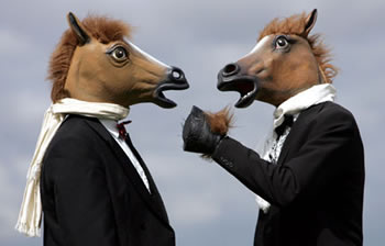 英國(guó)埃普瑟姆德比賽馬會(huì)是歐洲最豪華排場(chǎng)的賽馬大會(huì),為期兩天。圖為觀眾戴著馬頭交談。