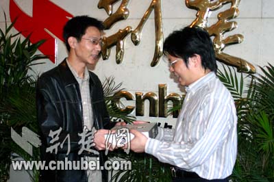 荊楚網副總編輯黃斌給從松滋趕來領獎的牟先生發(fā)獎