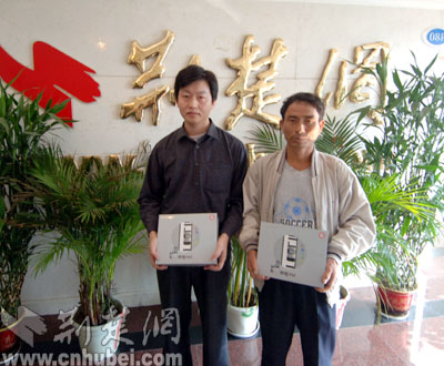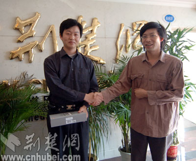荊楚網(wǎng)24日訊 記者艾丹 潘頔 報道:23日抽出的“讀報紙、發(fā)短信、中手機”活動的兩位幸運獲獎?wù),武漢的李先生和谷城的孟先生,今天下午來到荊楚網(wǎng)領(lǐng)獎,荊楚網(wǎng)總編輯閻思甜親自為他們頒獎。