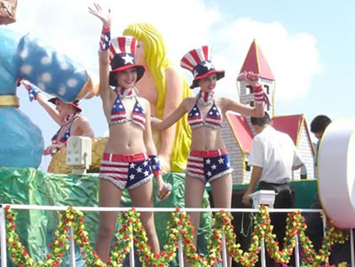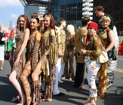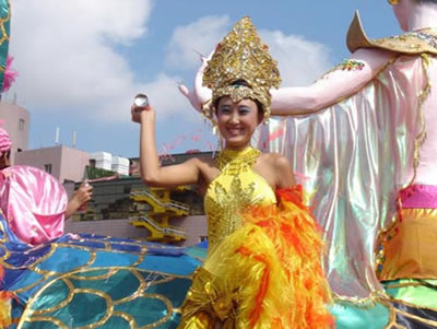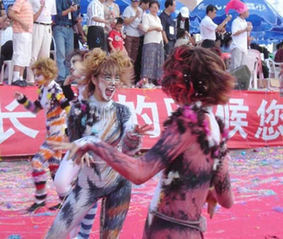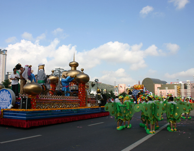 今天上午在新海廣場(chǎng)舉行的第六屆大連狂歡節(jié),更是使歡樂(lè)的海洋里掀起了歡樂(lè)的海潮。來(lái)自國(guó)內(nèi)外的24支狂歡巡游隊(duì)伍,以花團(tuán)錦簇的民族服裝和極度夸張的藝術(shù)手法,演繹了航天、花神、特洛伊木馬、梁山伯與祝英臺(tái)、孔雀仙子、海底動(dòng)物、蝴蝶服飾、阿凡提、醉酒、美人魚(yú)、回娘家、貓友、豪華游覽馬車(chē)、日月潭傳說(shuō)、堂吉訶德、木偶奇遇、狐假虎威、寶蓮燈、海娃與王子、小櫻丸子、尼爾斯騎鵝記、阿里巴巴、輪滑表演等國(guó)內(nèi)外著名童話,電影故事等。最為耀眼的是以音樂(lè)劇《貓》的扮相出場(chǎng)的表演隊(duì)伍,他們獨(dú)特的表演和造型贏得了在場(chǎng)觀眾最多的歡呼聲?駳g的服裝藝術(shù)巡游,吸引了數(shù)萬(wàn)國(guó)內(nèi)外游客和當(dāng)?shù)孛癖姷挠^賞。