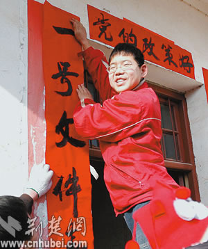 稅費(fèi)改革后的漢川農(nóng)民興高采烈貼對(duì)聯(lián)。本報(bào)記者王成鋼攝