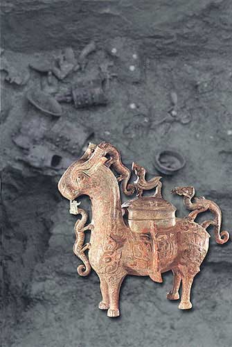 青銅犧尊;酒器(高12.07厘米,寬40.5厘米)[相關(guān)鏈接]:20世紀(jì)中國百項考古大發(fā)現(xiàn)(1-20)20世紀(jì)中國百項考古大發(fā)現(xiàn)(21-40)41、大甸子遺址和墓地(圖)42、偃師商城(圖)43、鄭州商城遺址(圖)44、盤龍城遺址(圖)45、安陽殷墟遺址(圖)46、吳城遺址(圖)47、新干大墓(圖)48、三星堆祭祀器物坑(圖)49、周原遺址(圖)50、豐鎬遺址與墓地(圖)51、琉璃河遺址(圖)52、晉侯墓地(圖)53、三門峽虢國墓地與上陽城遺址(圖)54、晉國故城遺址(圖) 55、鄭韓故城(圖)56、燕下都遺址(圖)57、曾侯乙墓(圖)58、紀(jì)南城周圍的墓葬群(圖)59、中山王陵(圖)60、銅綠山礦冶遺址(圖)
