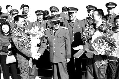 5時(shí)40分許,身著乳白色航天服的兩名航天員,在直升機(jī)探照燈的照射下,自主走出因與大氣劇烈摩擦而余熱尚存的返回艙,站在祖國(guó)的土地上,向歡迎的人們致意。