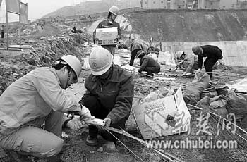 在泥濘的堰頂上,年輕的侯國榮正冒著霏霏細(xì)雨,指揮十幾名身著防爆服的工人,進(jìn)行爆破網(wǎng)絡(luò)連接作業(yè)。作為爆破的現(xiàn)場負(fù)責(zé)人,侯國榮和他的伙伴們從春節(jié)前就奮戰(zhàn)在工地上,一天也沒有休息。