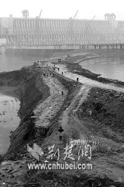 1997年11月大江截流后,三峽工程二期上、下游橫向圍堰在左岸動工,此圍堰將長江主河床截?cái),與一期形成的混凝土縱向圍堰共同形成二期基坑。在基坑內(nèi)建起了泄洪壩段、左岸廠房壩段及電站廠房等主體建筑物。2002年5月和7月,先后拆除了二期上、下土石橫向圍堰。