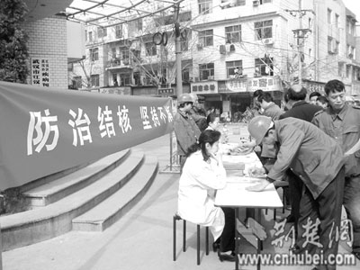 荊楚網(wǎng)(楚天都市報(bào))(記者 盧水平 通訊員 夏瓊 項(xiàng)征國(guó) 攝)昨日是世界防治結(jié)核病日,江漢區(qū)疾控中心為附近幾個(gè)建筑工地的280名農(nóng)民工,進(jìn)行免費(fèi)結(jié)核病透視篩查,結(jié)果發(fā)現(xiàn)5例可疑肺結(jié)核病人。據(jù)介紹,進(jìn)城務(wù)工者及流動(dòng)人口肺結(jié)核病患病率,高出市內(nèi)常住人口一倍,是目前城市結(jié)核病的重要傳染源。