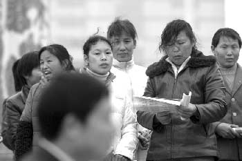在武漢2007春季首場(chǎng)農(nóng)民工招聘會(huì)上,幾位來(lái)自黃梅的農(nóng)民工在私下討論:“今年招工才剛開(kāi)始,要先比較哪家更好!