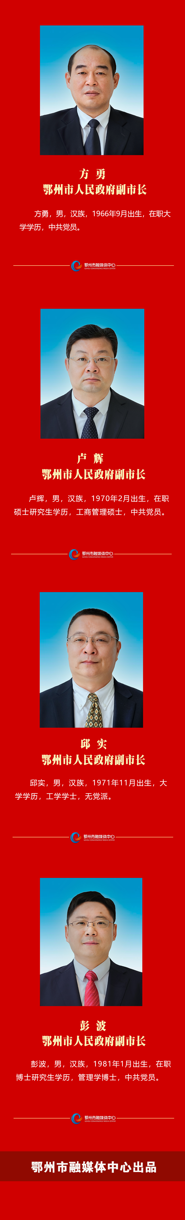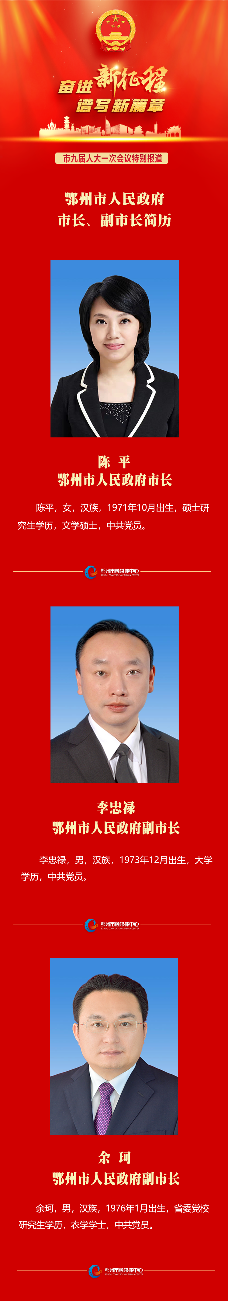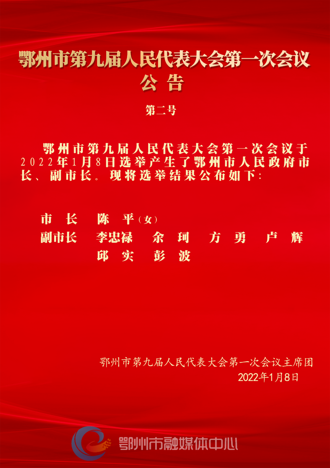 1月8日下午,鄂州市第九屆人民代表大會第一次會議圓滿完成各項議程,在市會議中心勝利閉幕。陳平當(dāng)選為鄂州市人民政府市長,李忠祿、余珂、方勇、盧輝、邱實、彭波當(dāng)選為鄂州市人民政府副市長。