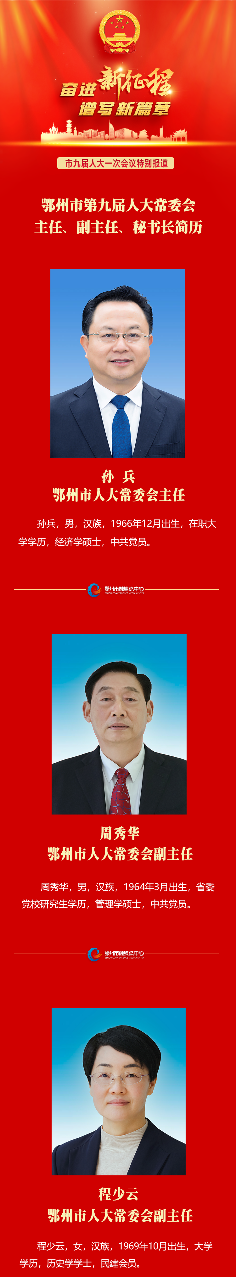 孫兵當(dāng)選為市九屆人大常委會主任,周秀華、程少云、王時文、葉祥明、尹彬、黃開勝當(dāng)選為市九屆人大常委會副主任,熊新陽當(dāng)選為市九屆人大常委會秘書長。王輝等33人當(dāng)選為市九屆人大常委會委員。