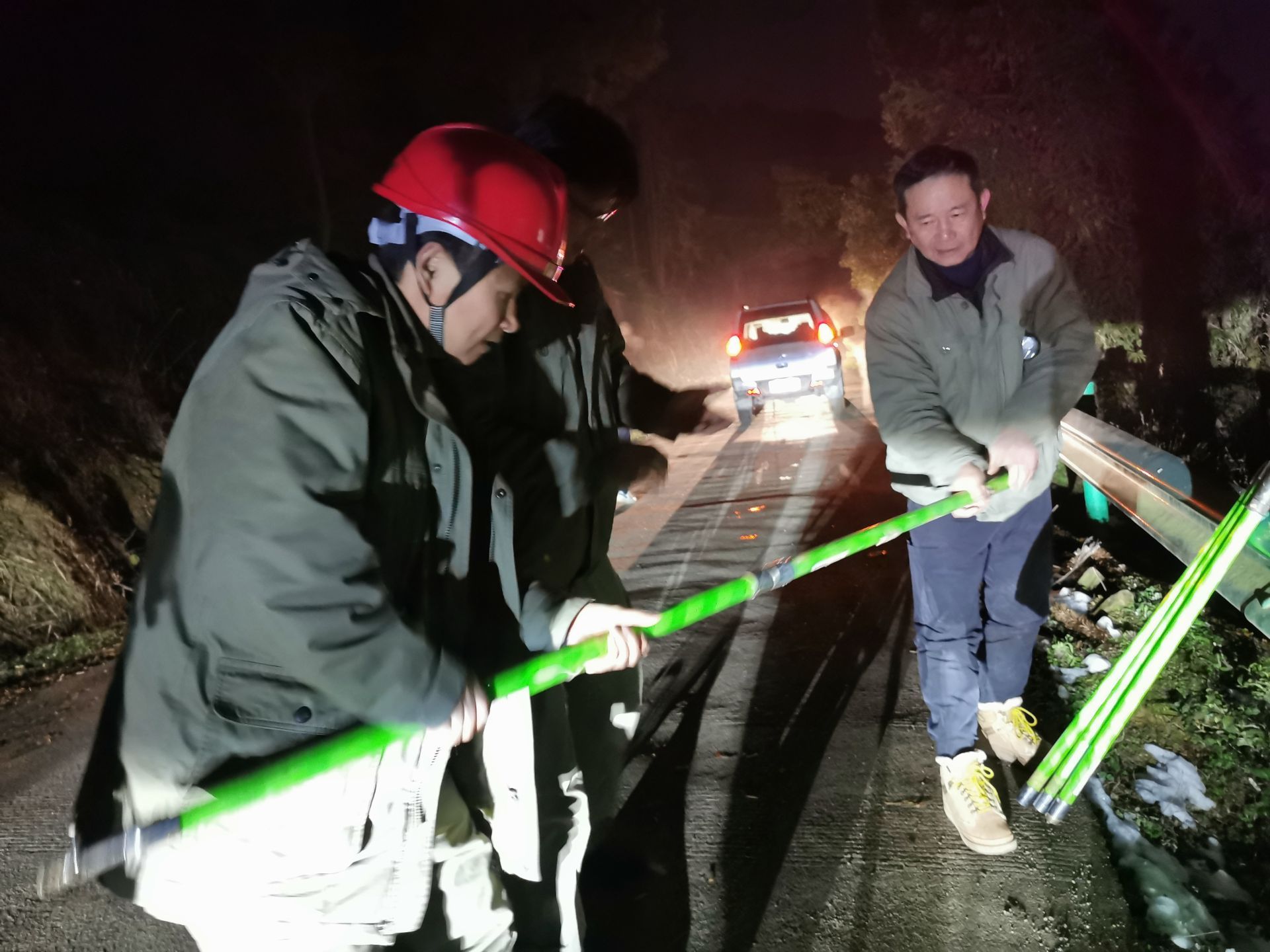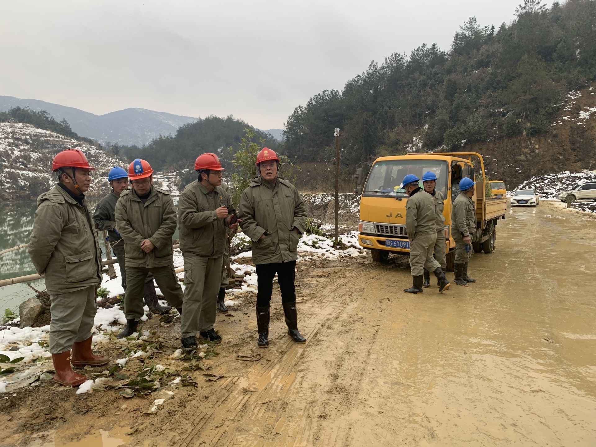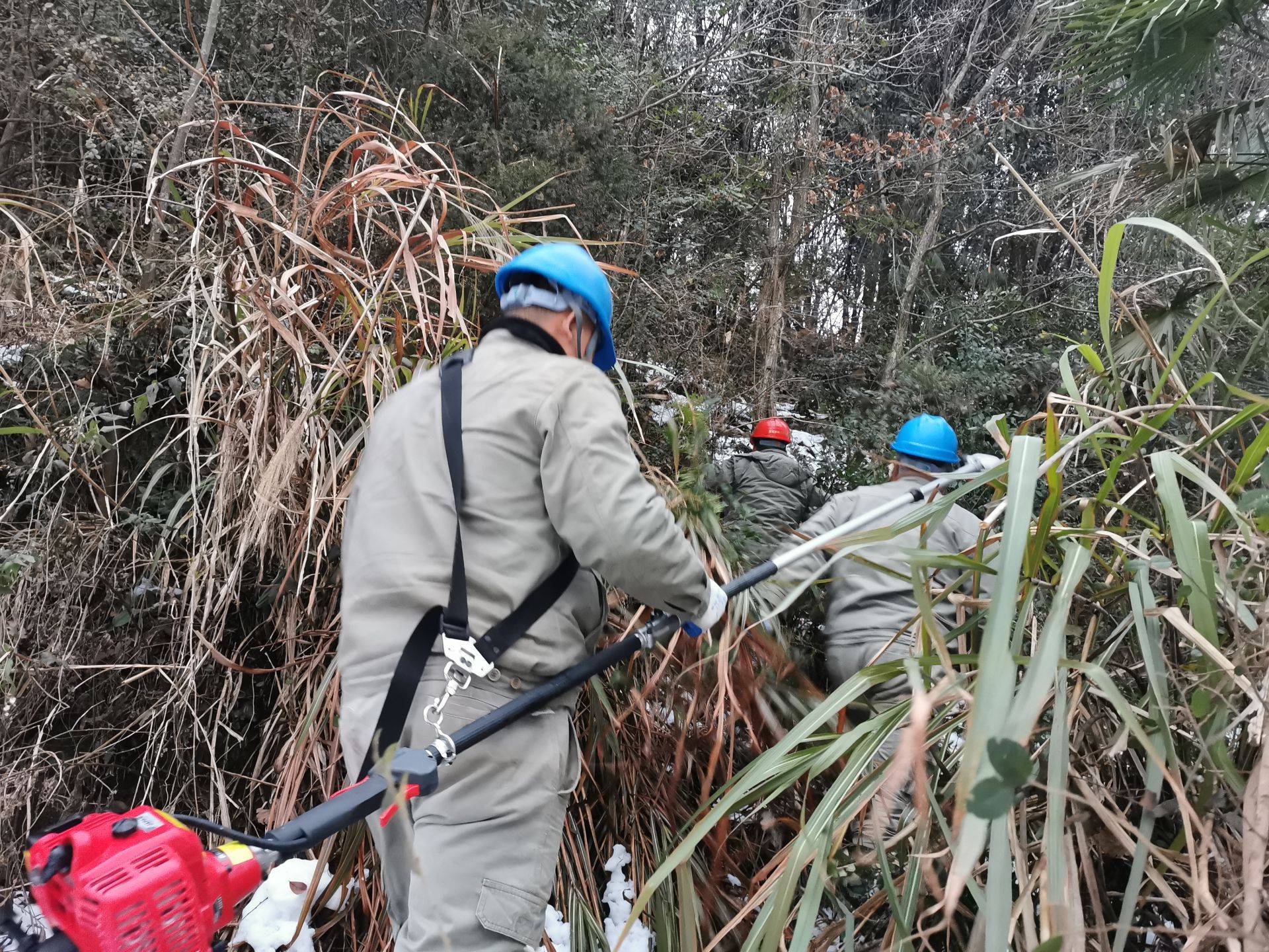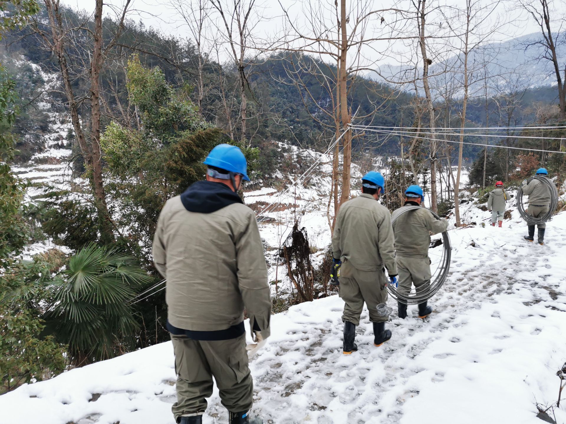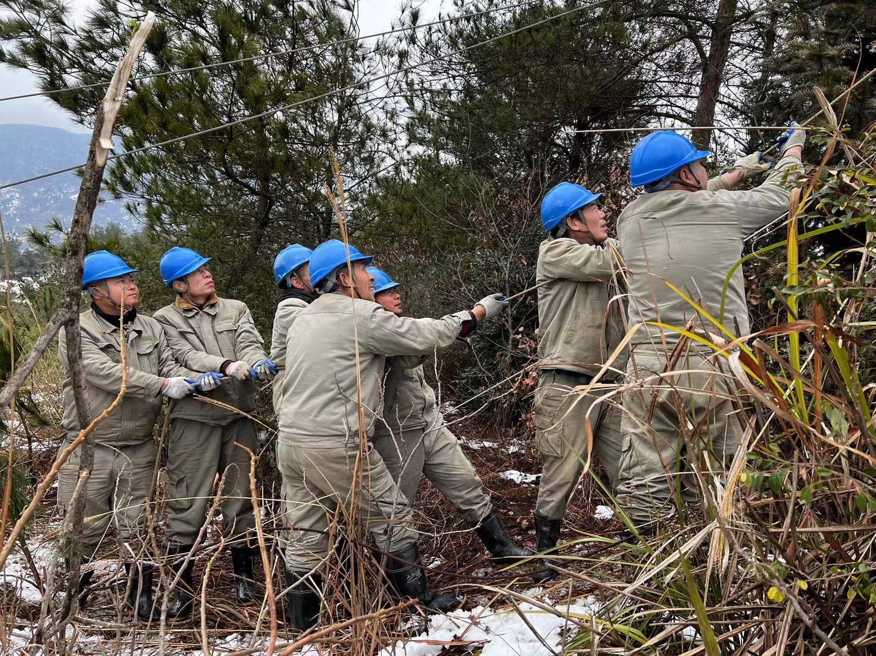 三溪、王英、楓林、排市等山區(qū),故障點多在密林深處,地形復雜,而且山路濕滑,一般車輛上不去,員工只能身扛搶修物資步行翻山越嶺巡線,一處處的尋找故障。山區(qū)溫度平均在零度以下,搶險人員衣服濕透,分不清汗水和雪水,臉被凍得如刀割,從早到晚,連續(xù)十個小時,滴米未進,運桿、拆桿、立桿、架線、接線....全身心投入搶修。