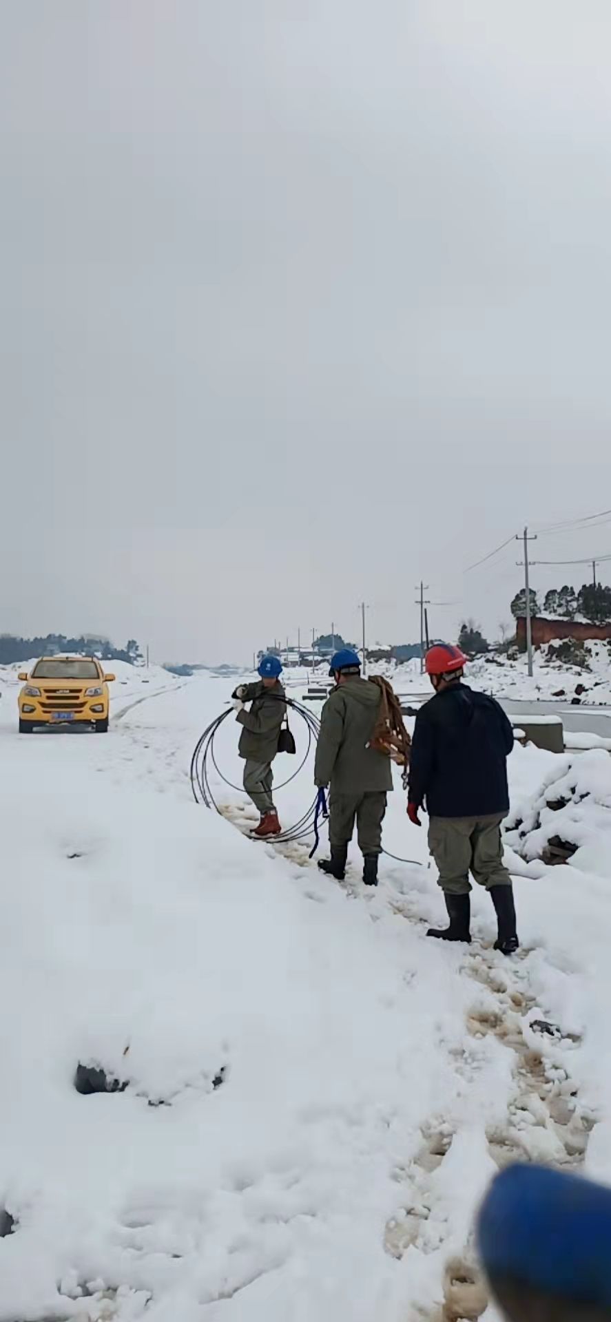 由于災情嚴重,黃石市高新區(qū)配電工程公司、市區(qū)配電工程公司、輸電分公司等4個兄弟單位帶人力、物資馳援陽新,公司員工自發(fā)組織10臺四驅(qū)車輛參與山區(qū)救援,累計200余名電力員工,60余臺車輛,在冰天雪地中與時間賽跑。