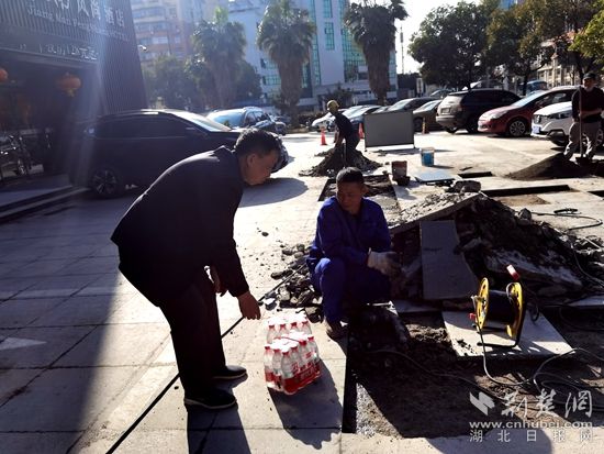 江南名居物業(yè)經(jīng)理見(jiàn)施工隊(duì)忙得熱火朝天,主動(dòng)送來(lái)兩箱礦泉水,感謝他們的辛苦付出,他說(shuō):“為了居民的出行安全,你們辛苦了。”