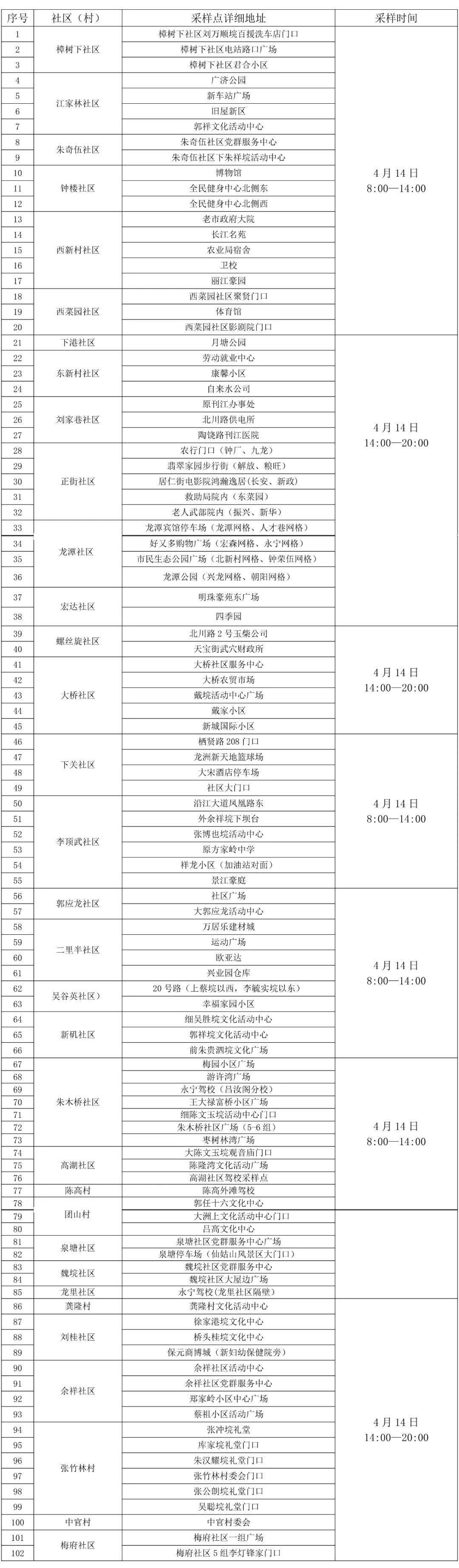 2.請(qǐng)廣大市民朋友按照所在社區(qū)(村組)通知的時(shí)間和地點(diǎn),分時(shí)段、分區(qū)域有序前往現(xiàn)場(chǎng)采樣(采樣點(diǎn)設(shè)置表附后)。