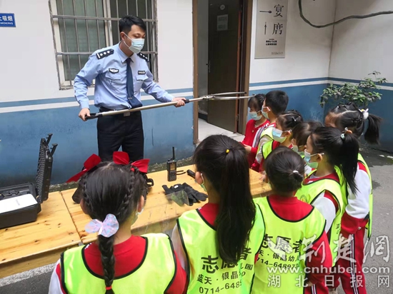為了歡迎小朋友們的到來(lái),民警們也準(zhǔn)備了一堂生動(dòng)有趣的安全知識(shí)教育課,并向小朋友們展示了警棍、電槍、手銬等警用裝備。小朋友們聽(tīng)得十分入神,并時(shí)不時(shí)發(fā)出驚嘆聲。