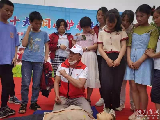 武穴市紅十字會(huì)老師通過(guò)情景模擬、現(xiàn)場(chǎng)教學(xué)等方式為孩子們上了一堂生動(dòng)的應(yīng)急救護(hù)課。通訊員 供圖