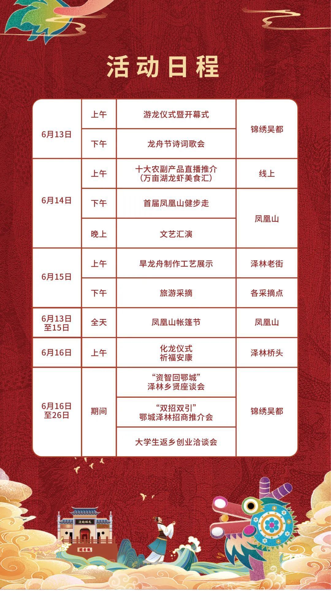 據(jù)悉,節(jié)日期間,澤林鎮(zhèn)每天均會組織各種豐富多彩的文旅體驗活動,活動以線上為主,線下為輔,打造了包括旱龍舟巡游、詩詞歌會、健步走運動、文藝匯演、旱龍舟制作工藝展示、特色農(nóng)副產(chǎn)品展銷、旅游采摘、鳳凰山帳篷節(jié)、化龍祈福等九大活動,同期還將舉辦鄉(xiāng)賢座談會、招商推介會、大學(xué)生返鄉(xiāng)創(chuàng)業(yè)洽談會等各項會議。
