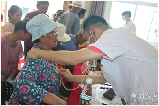 當(dāng)天恰逢“大暑”,烈日炎炎,山路崎嶇,隊(duì)員們穿著白大褂、志愿者馬甲,攜帶診療設(shè)備、健康資料,到達(dá)黨員活動中心時(shí)已經(jīng)汗流浹背,但他們顧不上喝一口水,立即各司其職:義診、量血壓、測血糖、按需贈送藥品,志愿者們忙著維護(hù)秩序,引導(dǎo)大家保持適當(dāng)距離,幫扶行動不便的老人。