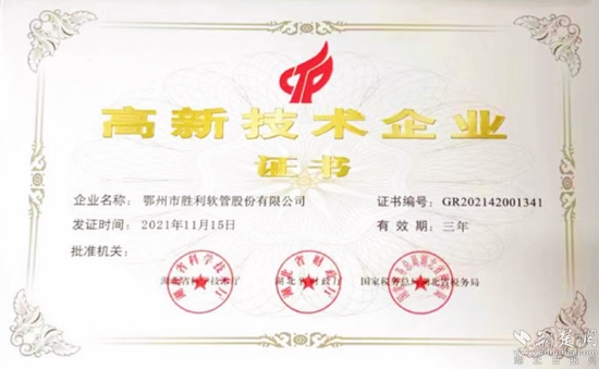 2019年,勝利軟管獲得湖北省支柱產(chǎn)業(yè)細分領(lǐng)域隱形冠軍培育企業(yè);2021年,勝利軟管獲得“湖北省高新技術(shù)企業(yè)”稱號;2022年,勝利軟管成功入圍湖北省第四批專精特新“小巨人”企業(yè)。
