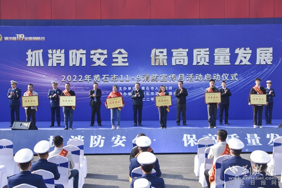 啟動儀式上,黃石市消防救援支隊支隊長程雄鷹部署了消防宣傳月相關工作,市委宣傳部副部長丁元拾宣讀了《關于表彰全市優(yōu)秀消防志愿服務團隊和消防宣傳志愿者的通報》,與會領導為獲獎團隊和個人代表頒發(fā)了獎牌及證書。