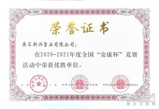 荊楚網(wǎng)(湖北日報網(wǎng))訊(通訊員 石國良 柯雪梅)近日,中華全國總工會、應(yīng)急管理部、國家衛(wèi)生健康委員會聯(lián)合發(fā)文,表彰2020年-2021年度全國“安康杯”競賽活動先進集體和優(yōu)秀個人。其中,黃石新興管業(yè)被評為2020-2021年度全國“安康杯”競賽活動優(yōu)勝單位。