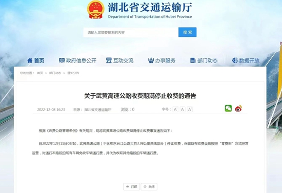 剛剛,湖北省交通運(yùn)輸廳發(fā)布關(guān)于武黃高速公路收費(fèi)期滿停止收費(fèi)的通告。