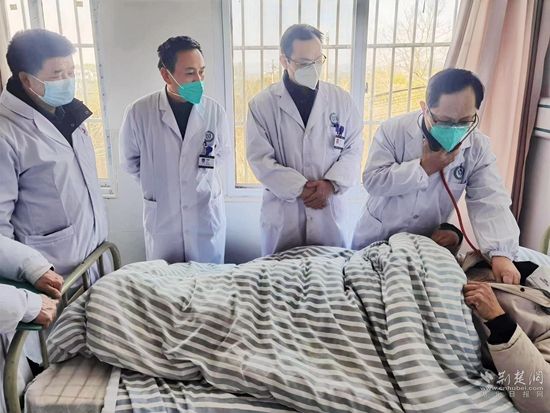 荊楚網(wǎng)(湖北日報(bào)網(wǎng))訊(通訊員程曉林 李 勇 饒國健)1月6日下午4時(shí)10分,在浠水縣綠楊鄉(xiāng)衛(wèi)生院三樓住院部病房里,浠水縣人民醫(yī)院副院長、主任醫(yī)師黃大雄帶領(lǐng)該院第5醫(yī)療救治專家組主任醫(yī)師付鴻鷹、副主任醫(yī)師柴小利同綠楊衛(wèi)生院醫(yī)務(wù)人員一起,給82歲的新冠感染患者張鳳銀婆婆進(jìn)行會診。