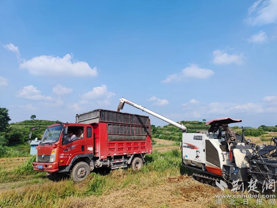 “今年麥子長勢非常不錯,鎮(zhèn)村干部到戶宣傳赤霉病和病蟲害防治相關知識,農業(yè)專家到田間地頭查看指導防控,我今年種了10畝小麥,畝產達到了600多斤,比去年高出10%呢,而且今年村里還組織了收割機收割,10畝地不到2小時就收割完了,省時省力,方便得很?!卑殡S著“嗡嗡”的脫粒聲,樟樹嶺村八組村民陳華紅高興道。