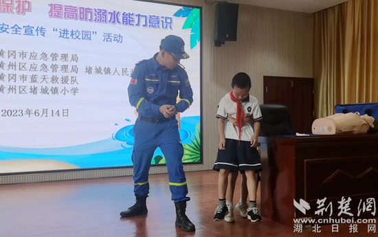 走進堵城小學(xué),來自黃岡市藍天救援隊的專業(yè)講師正向同學(xué)們宣傳防溺水安全知識,對突發(fā)溺水應(yīng)急處置、心肺復(fù)蘇術(shù)等自救互救技能進行了演示。