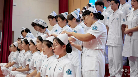 在激昂的黃岡市中心醫(yī)院院歌中,專家前輩和護士長代表為新職工們佩戴聽診器和燕尾帽,并一起重溫了中國醫(yī)師宣言和南丁格爾誓詞。新職工們肅然站立、莊嚴宣誓,鏗鏘有力的誓言久久回蕩。一張張青春洋溢的臉龐,一聲聲莊嚴的承諾,都詮釋著投身醫(yī)療事業(yè)的無限榮光。