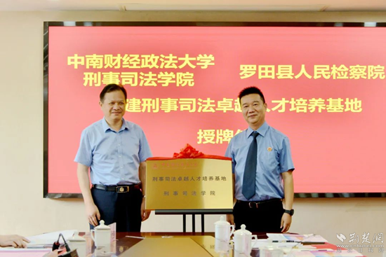 當(dāng)天,中南財(cái)經(jīng)政法大學(xué)刑事司法學(xué)院與羅田縣人民檢察院舉行共建刑事司法卓越人才培養(yǎng)基地簽約揭牌儀式,中南財(cái)經(jīng)政法大學(xué)刑事司法學(xué)院院長胡向陽,羅田縣人民檢察院黨組書記、檢察長汪輝為檢校共建協(xié)議簽約,為“刑事司法卓越人才培養(yǎng)基地”揭牌。
