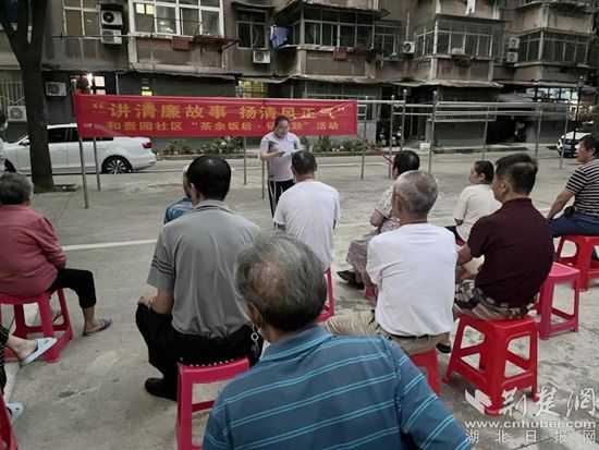 傍晚時(shí)分,身處湖濱花園小區(qū)的“和悠然 慢生活”休閑廣場,第二黨支部書記呂培根分享了《留得清氣滿乾坤》廉潔故事匯中的周恩來廉潔自律的故事。他勸誡領(lǐng)導(dǎo)干部們,要想成功度過思想、政治、社會、親屬和生活的五道關(guān)口,就必須堅(jiān)守共產(chǎn)黨員的政治操守和優(yōu)良作風(fēng)。