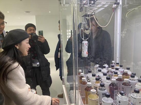 采風(fēng)團(tuán)一行走進(jìn)元?dú)馍窒虒幑S,通過(guò)沉浸式觀光通道,一行人零距離感受生產(chǎn)過(guò)程,只見(jiàn)飲料生產(chǎn)線正高速運(yùn)轉(zhuǎn),一瓶瓶飲料飛速被裝進(jìn)箱子里,統(tǒng)一打包進(jìn)入倉(cāng)庫(kù)。