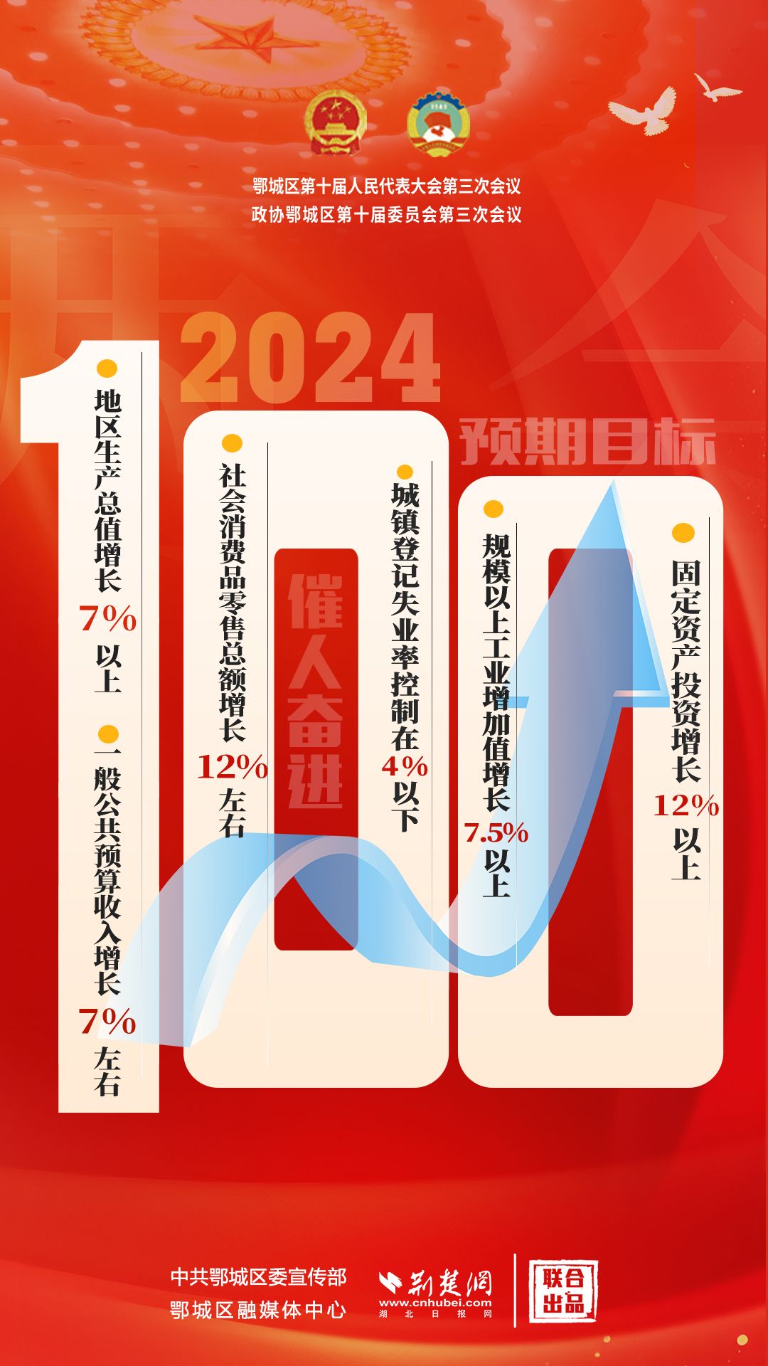 “100”解釋:2024年經(jīng)濟社會發(fā)展主要預(yù)期目標是,地區(qū)生產(chǎn)總值增長7%以上,一般公共預(yù)算收入增長7%左右,社會消費品零售總額增長12%左右,城鎮(zhèn)登記失業(yè)率控制在4%以下,規(guī)模以上工業(yè)增加值增長7.5%以上,固定資產(chǎn)投資增長12%以上,服務(wù)業(yè)增加值增長7.5%左右。