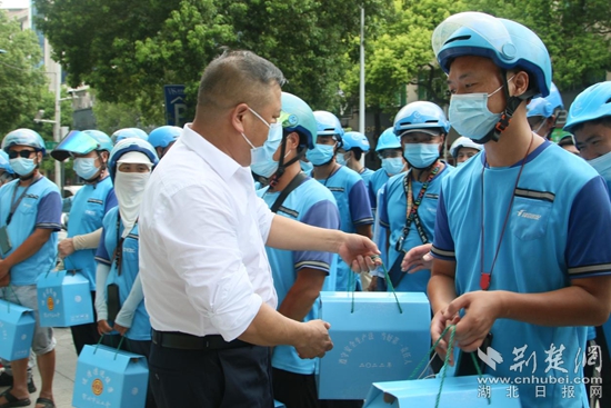 在“餓了么”配送點慰問餓了么新業(yè)態(tài)產(chǎn)業(yè)工人。通訊員 供圖