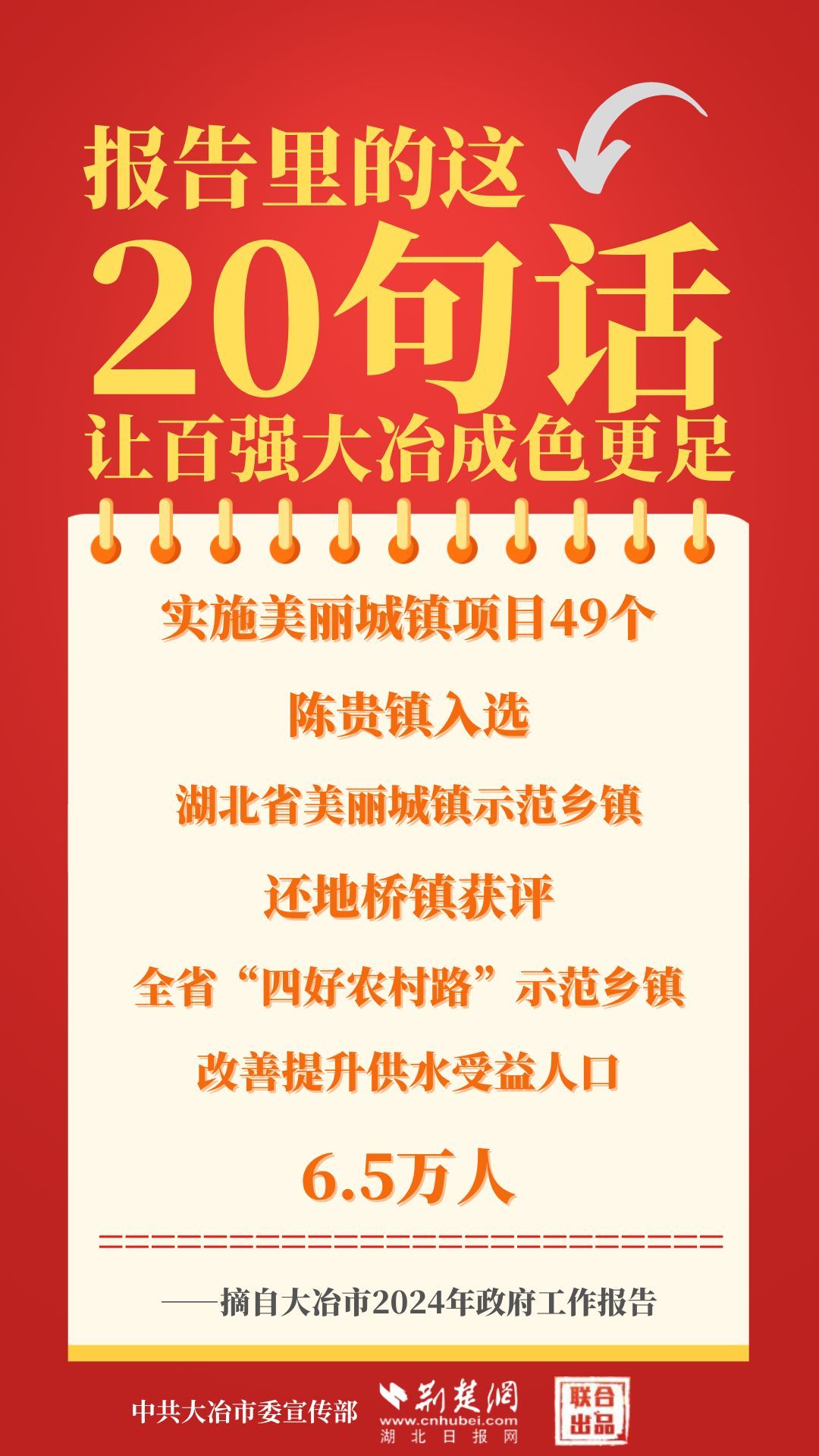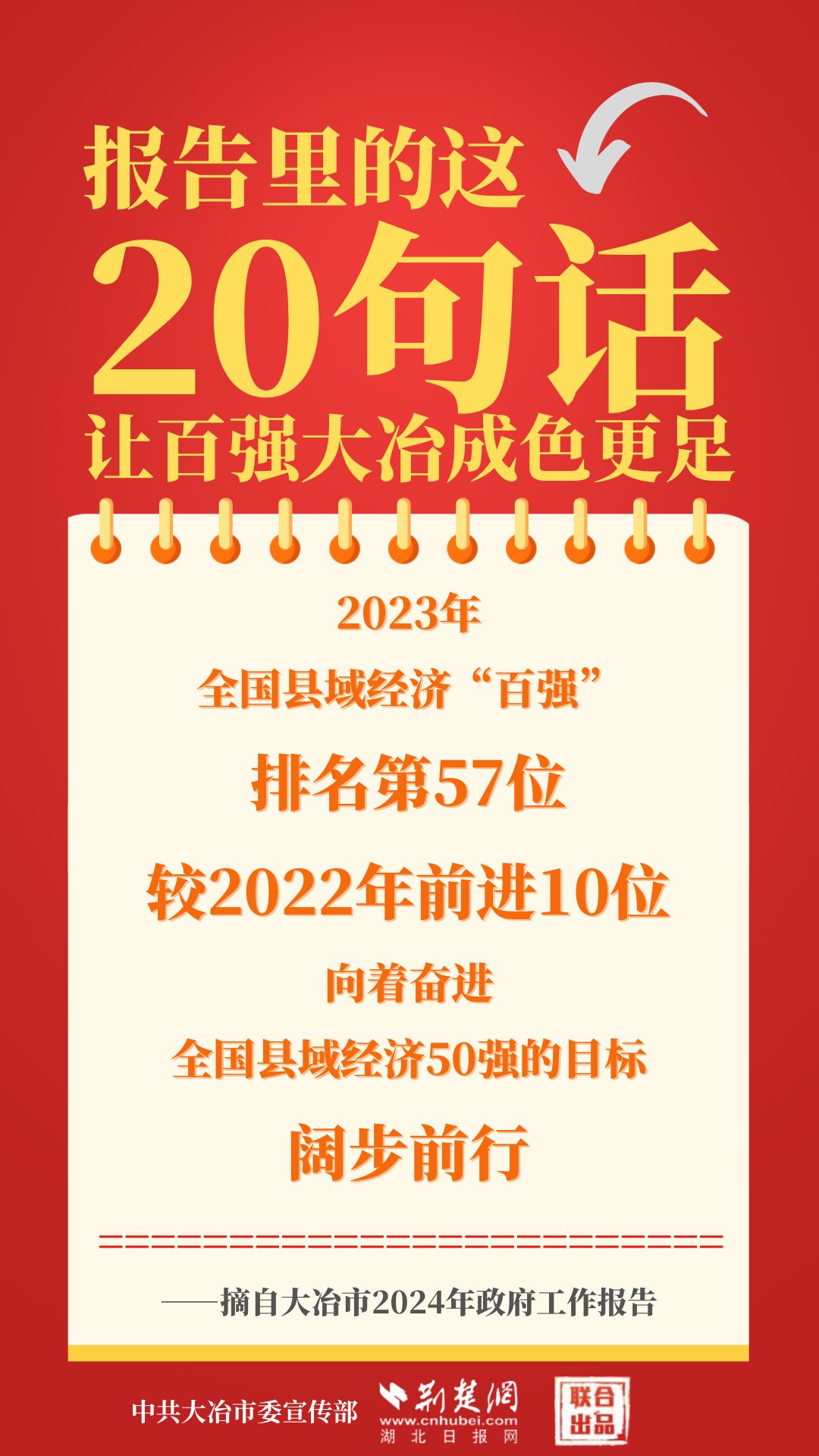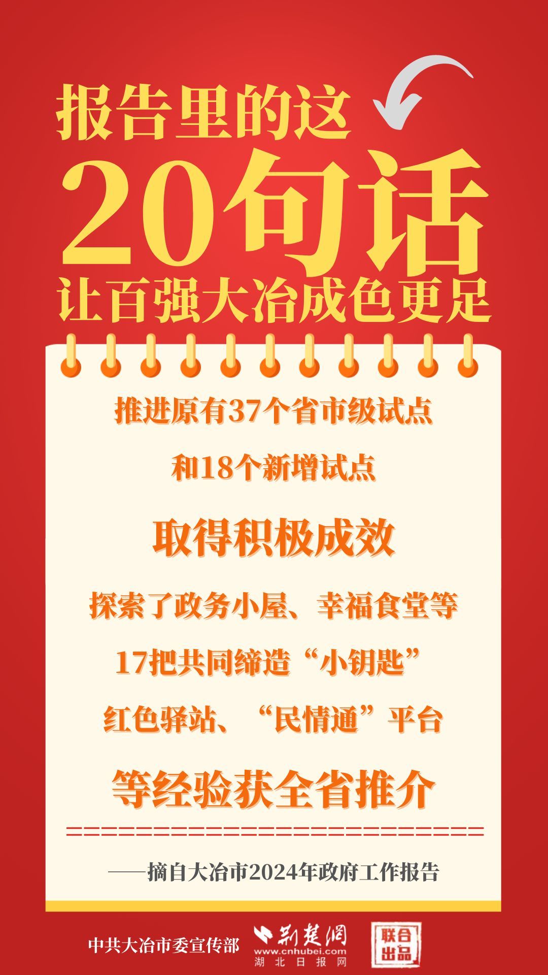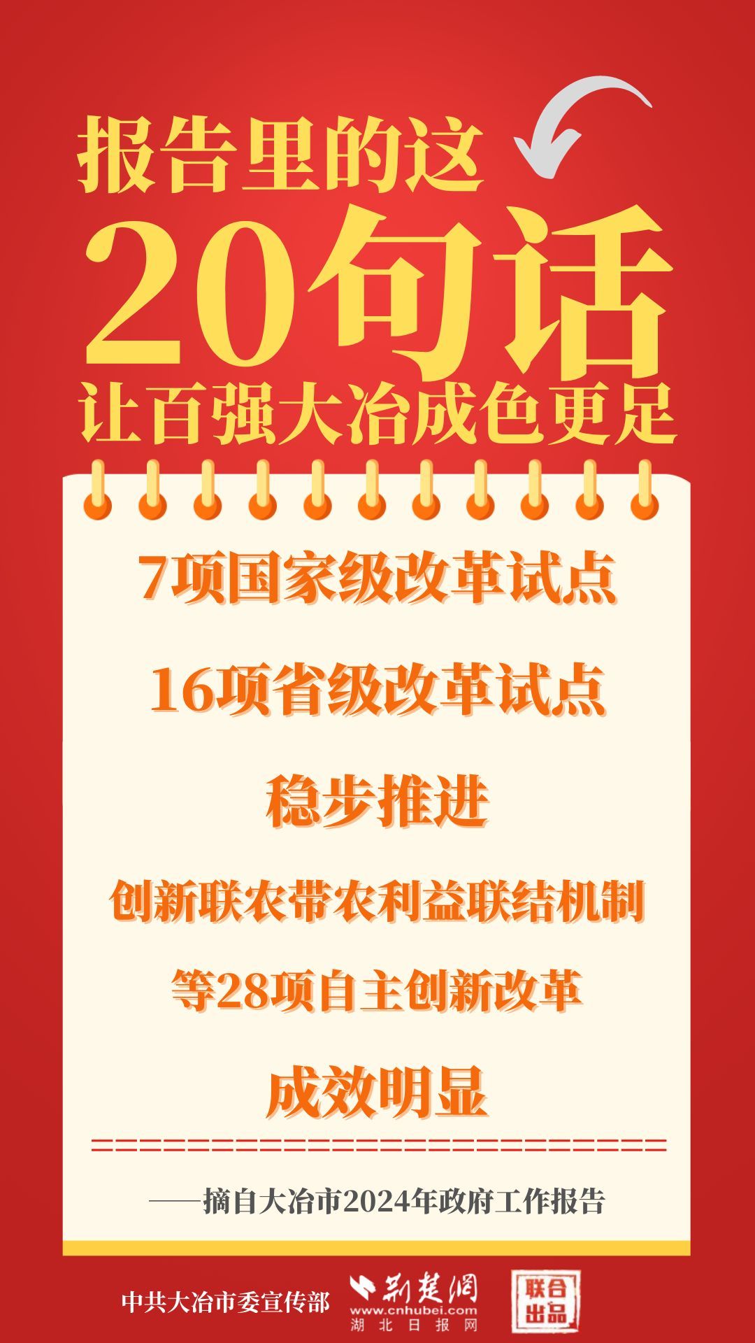 1月12日,大冶市第七屆人民代表大會第四次會議開幕,大冶市委副書記、市長孫輒作政府工作報告。報告里的這20句話,讓百強(qiáng)大冶成色更足。
