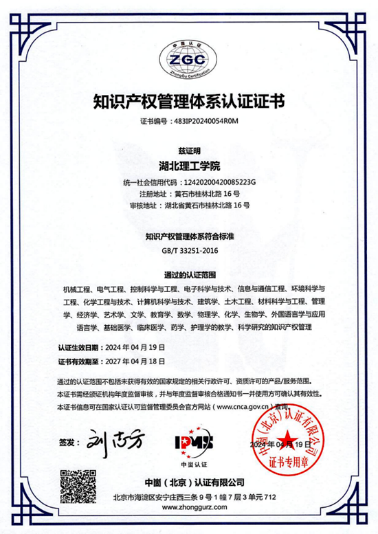今年3月26日至29日,中崮(北京)認(rèn)證有限公司派出專家組進(jìn)駐該校,通過(guò)個(gè)別訪談、實(shí)地走訪、資料查閱等方式展開(kāi)現(xiàn)場(chǎng)審核和對(duì)標(biāo)驗(yàn)收。經(jīng)審核考察,專家組對(duì)湖北理工學(xué)院知識(shí)產(chǎn)權(quán)管理工作給予了高度肯定,并一致同意該校通過(guò)知識(shí)產(chǎn)權(quán)管理體系認(rèn)證。
