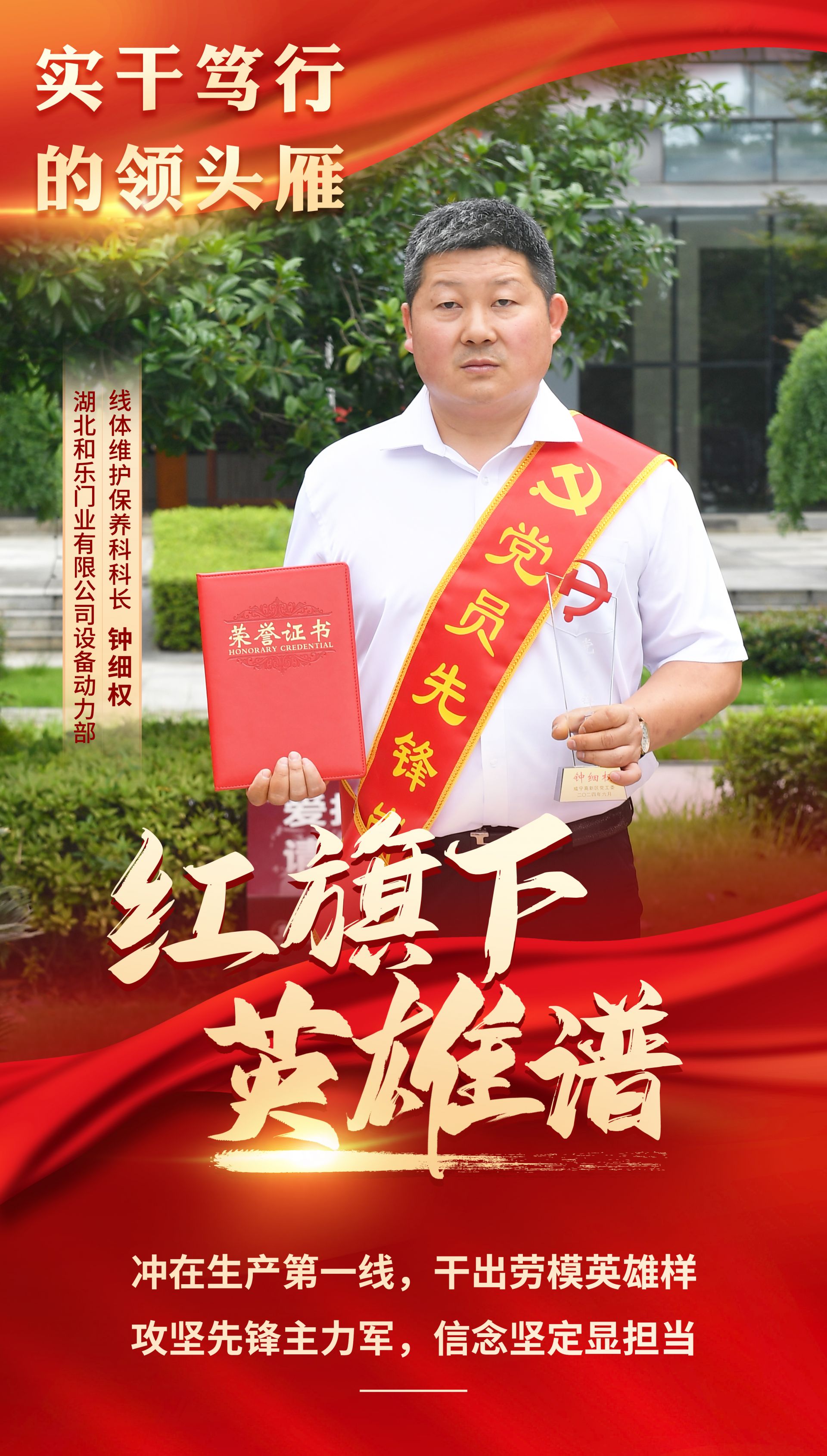 為進一步發(fā)揮黨支部戰(zhàn)斗堡壘和黨員先鋒模范作用,咸寧高新區(qū)黨工委研究決定,授予鐘細權(quán)等10名同志“黨員先鋒崗”榮譽稱號。