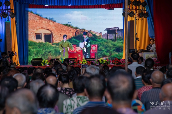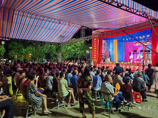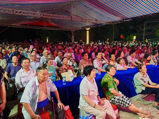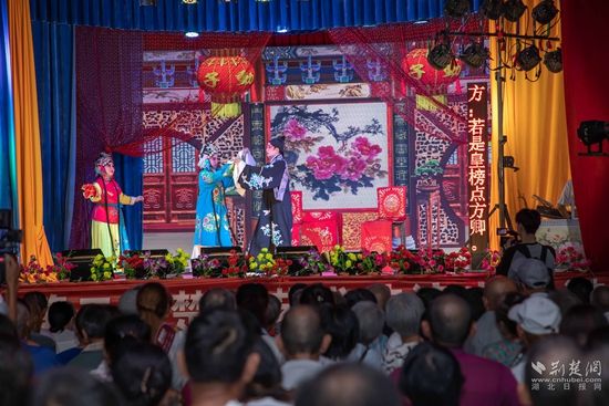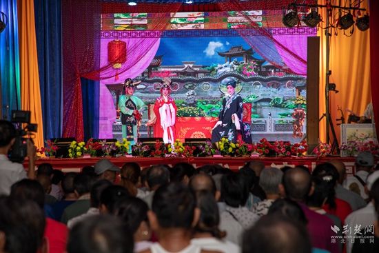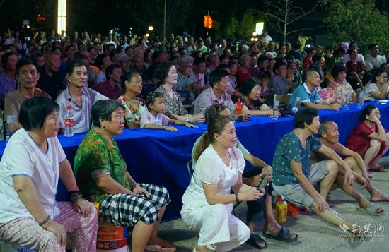當(dāng)晚7點(diǎn),廣場(chǎng)上人聲鼎沸、鑼鼓喧天、座無(wú)虛席,來(lái)自周邊村鎮(zhèn)的老百姓偕老扶幼聚集于此,共襄楚劇盛會(huì)。