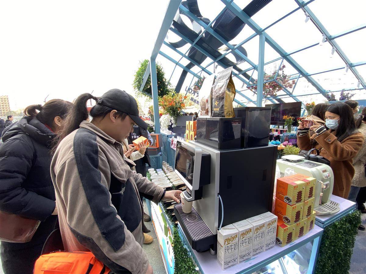 在武商夢(mèng)時(shí)代“國(guó)潮好物市集”,不少市民在漢口北國(guó)際貿(mào)易城展區(qū)體驗(yàn)自動(dòng)咖啡機(jī)。(記者劉天縱攝)