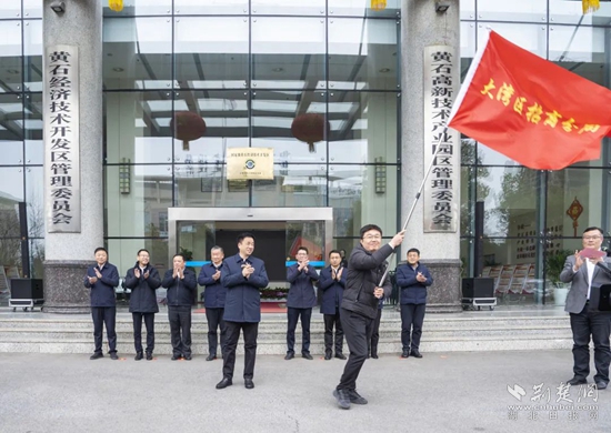 “期待你們凱旋而歸,出征!”授旗儀式上,黃石經(jīng)濟(jì)技術(shù)開發(fā)區(qū)黨工委書記、管委會(huì)主任、鐵山區(qū)委書記萬鼎為大灣區(qū)招商分局、三角招商分局、武漢招商分局、鐵山街道招商專班授旗,4名招商專班負(fù)責(zé)人鄭重接過旗幟。