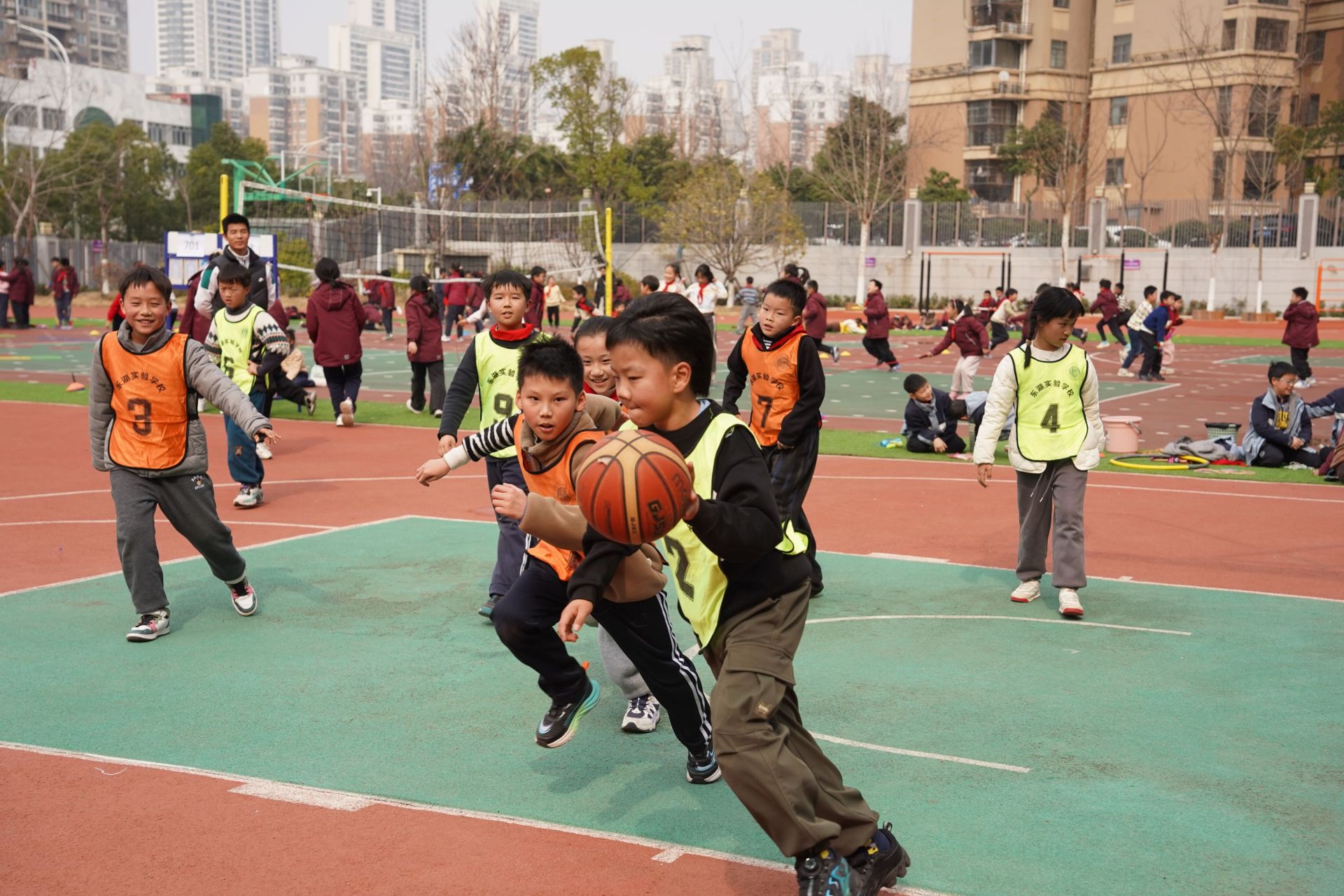 運(yùn)球、突破、投籃……一場(chǎng)激烈的籃球比賽正在東湖實(shí)驗(yàn)學(xué)校操場(chǎng)上進(jìn)行,小球員們身著鮮艷的隊(duì)服,臉上洋溢著稚嫩卻堅(jiān)定的神情。