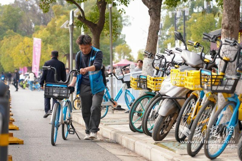 “你好,請往這邊有序停車。前行200米就是櫻園大門,那邊不好停車?!痹隰斈ヂ窋埓渫\噲龈浇?,單車運(yùn)維人員正在引導(dǎo)騎行游客前往指定區(qū)域停放單車。