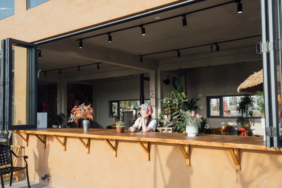 靠窗的吧臺也十分吃香,時不時有年輕的女孩端起咖啡,輪番坐上吧臺椅拍照,背景是屋外的稻田與花海,非?!俺銎?。
