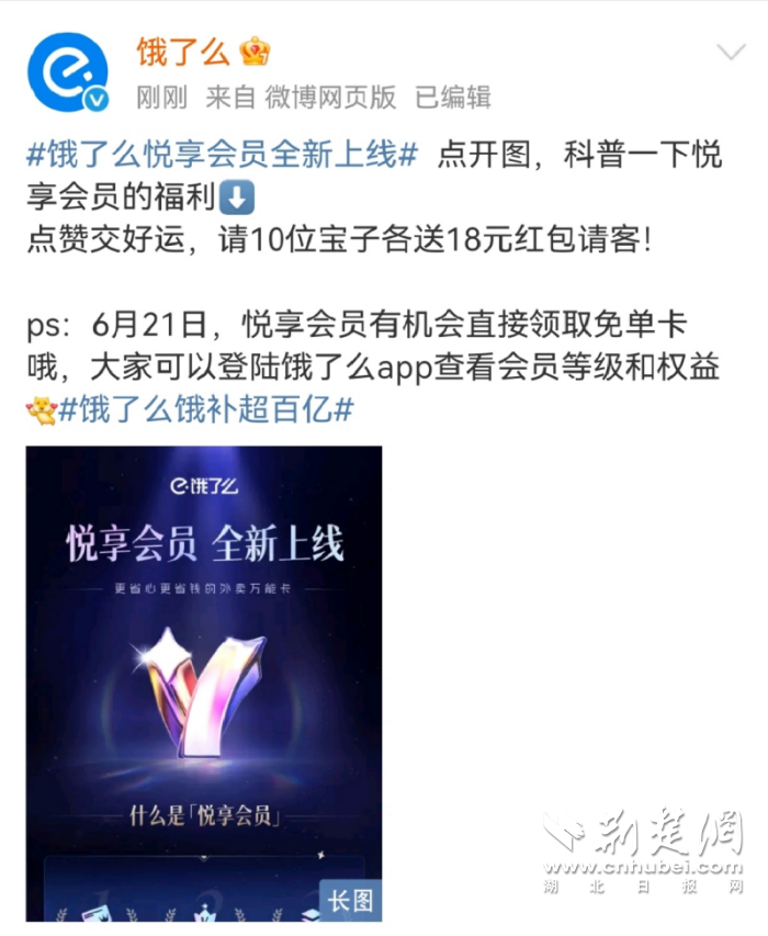 荊楚網(wǎng)(湖北日報網(wǎng))訊(通訊員 易曄)在“外賣大戰(zhàn)”持續(xù)升溫的背景下,餓了么近日繼續(xù)發(fā)力用戶側(cè)體驗升級。6月18日,餓了么官宣已在全國上線“悅享會員”,推出多項貼心服務和專屬權(quán)益,主打讓用戶“用得多省得多”。