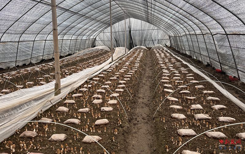在外婆橋生態(tài)農(nóng)莊,羊肚菌大棚內(nèi)菌香四溢,工人們正將新鮮菌菇分揀裝箱;不遠處的綠皮火車主題咖啡館別具特色。