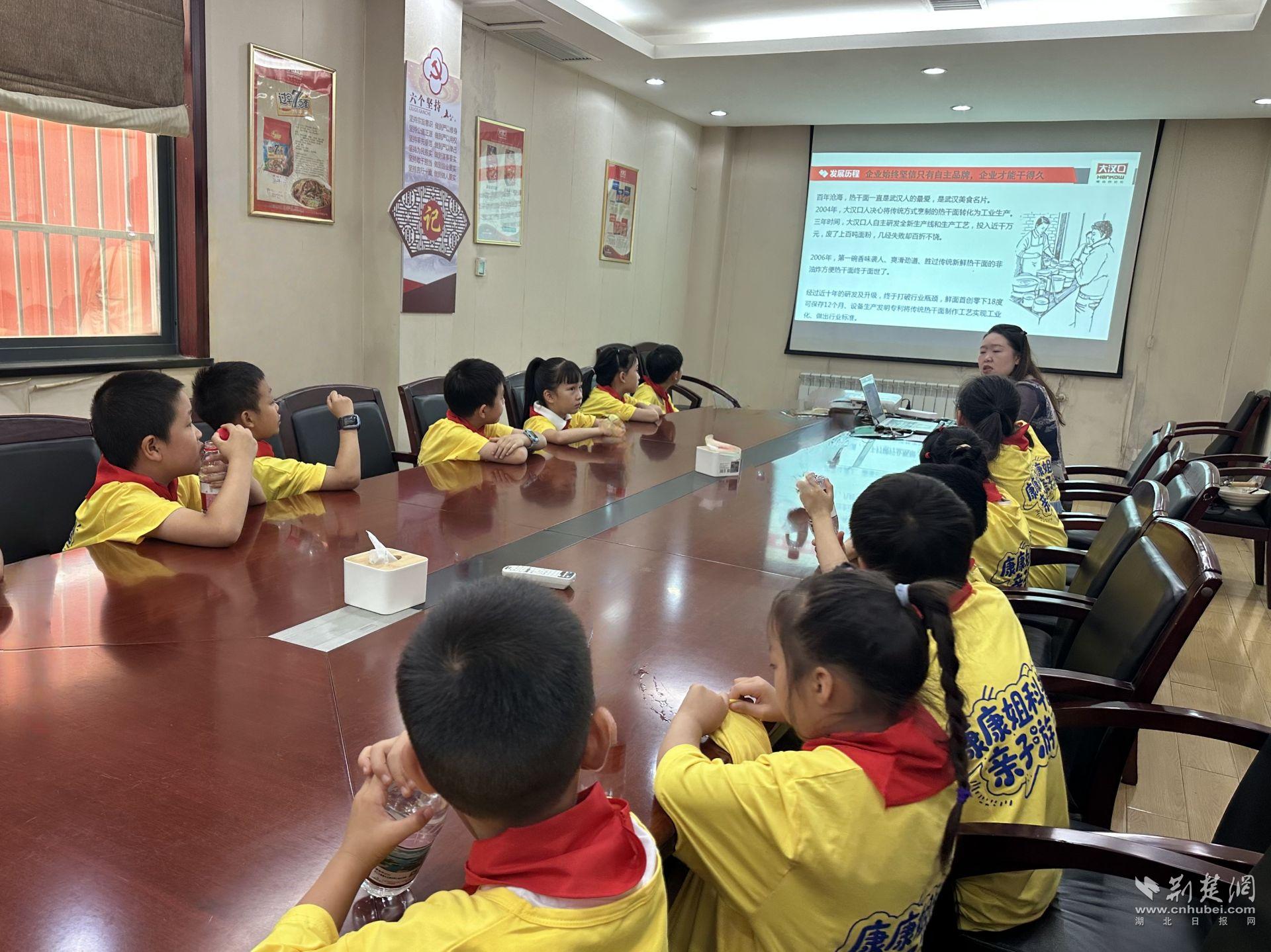 走進(jìn)企業(yè)展廳,孩子們立即被展廳擺放的各類熱干面樣品所吸引。