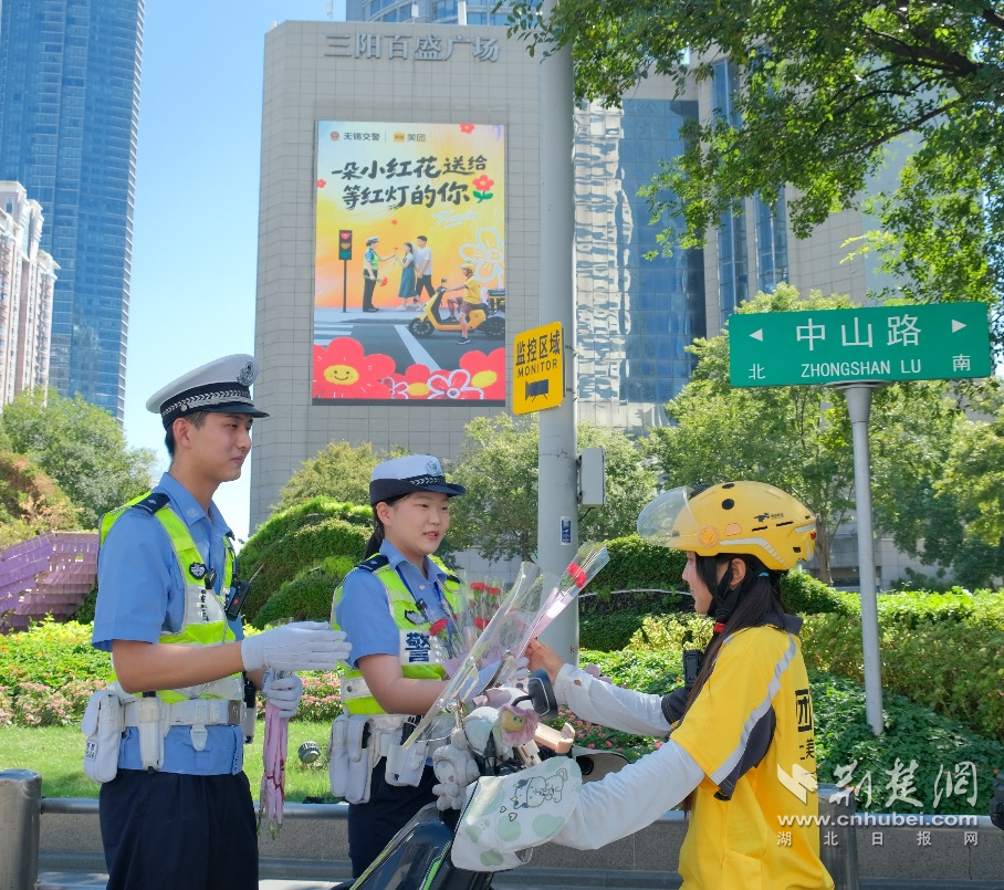 圖為:江蘇省無錫市中山路附近,兩位城市交警現(xiàn)場(chǎng)為騎手送小紅花,倡導(dǎo)安全出行。