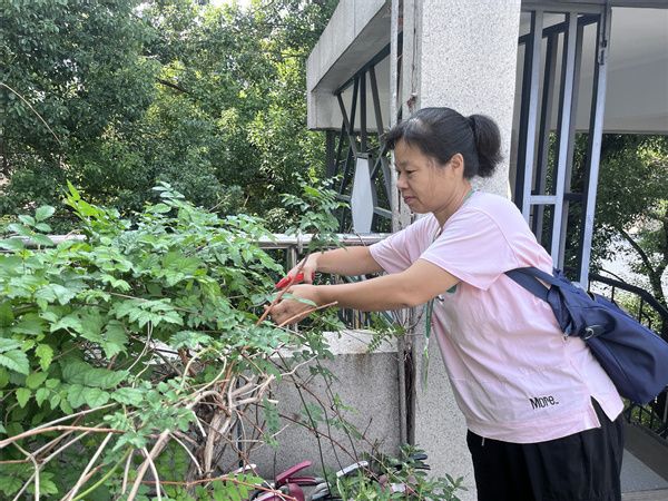 紅衛(wèi)路街道才聚社區(qū)園藝師肖福英修剪凌霄花枝條。 通訊員供圖